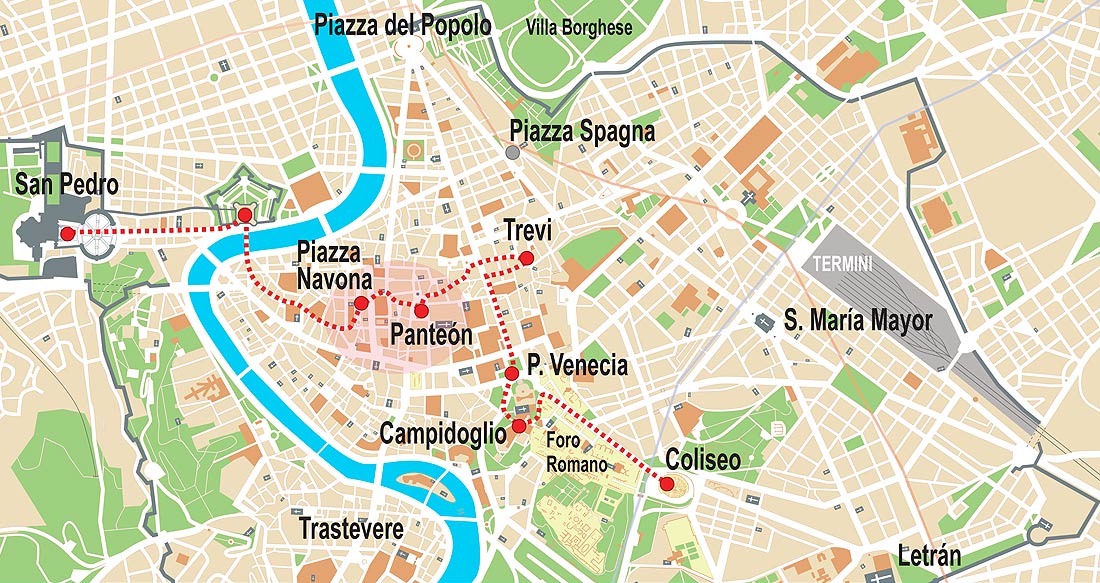 | DAY 1 | The Vatican 1. St. Peter’s Church 2. Castle Sant’Angelo | Downtown 1. Piazza Navona 2. Pantheon 3. Piazza Venezia (Imperial Forums) 4. Trevi Fountain 5. Zona del Popolo | 1. Gesù 2. Piazza di Spagna 3. Quirinal |